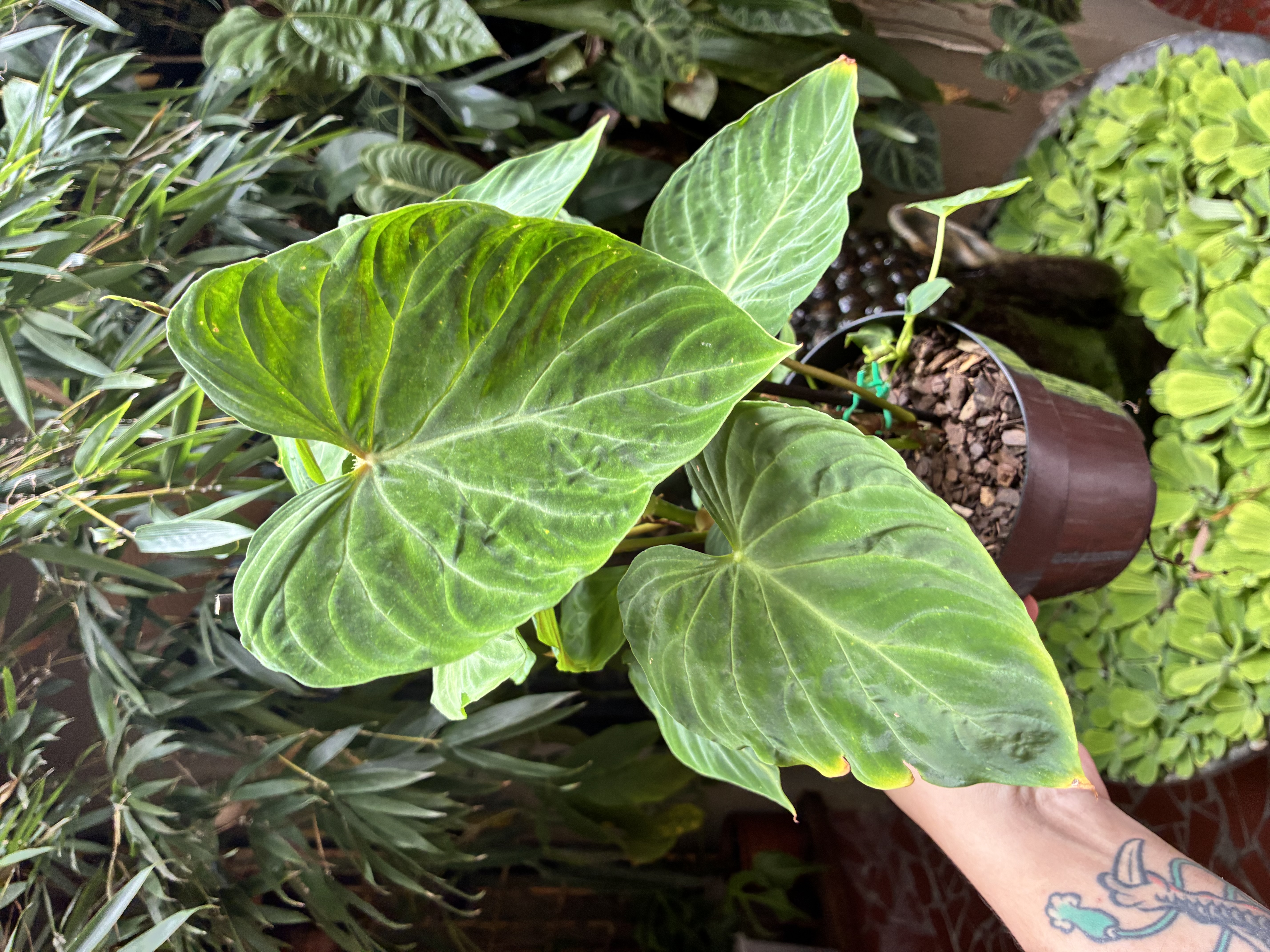 Folhagem ornamental oriunda da América Central e do Sul. Folhas aveludadas verde com tons amarronzadas na face superior e verde com rubro na face inferior. Uma característica marcante é o pecíolo piloso (cabinho peludinho). Aprecia meia-sombra (apenas as primeiras horas de sol fraco da manhã ou do final da tarde), clima quente, alta umidade do ar e substrato úmido rico em matéria orgânica. Caso o ar esteja seco, borrifar as folhas ou usar um umidificador. Sua inflorescência não possui importância ornamental. Para o melhor desenvolvimento da planta, é necessário a utilização de um tutor para que a planta utilize como apoio para escalar.